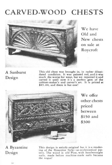 Both upper and middle classes were the objects of a new advertising campaign. The October 1930 issue of the Roycrofter offered two chests for sale. The advertising copy stated that: