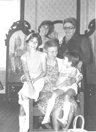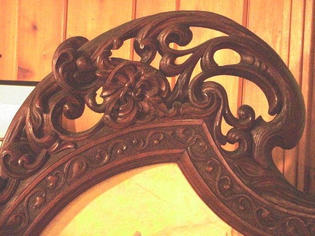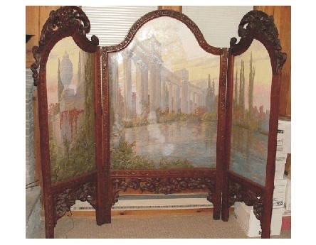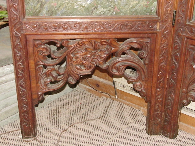 Seen in the Roycroft Gift Shop (the original blacksmith / copper shop built in 1902), in a room devoted to Roycroft antiques, was a three-panel room screen similar to the four-panel screen described above. This screen was also adorned with a Richard Kruger painting. The frame appeared to be carved from wood softer than oak but its dark red brown stain masked its true identity. The upper scroll work as well as the lower detail can be seen in these close-up photos. This same screen is pictured in Robert Rust and Kitty Turgeon's book, Images of America--The Roycroft Campus. Shown on page 26, we see a photograph taken in 1977 with four generations of Hubbard women seated in and surrounding a chair in the William Morris Room of the Roycroft Inn. In the background is the same three-panel screen. The caption under the photo states:, "In this 1977 view, four generations of Hubbard women pose in the William Morris Room of the Roycroft Inn. Miriam Hubbard Roelofs, the daughter of Elbert and Alice is seated. On the right is Nancy Hubbard Brady, the granddaughter of Elbert and Bertha. Also pictured are her daughter Linda and her children, Cindy (left) and Kelly Lynn Falkosky (front right)."