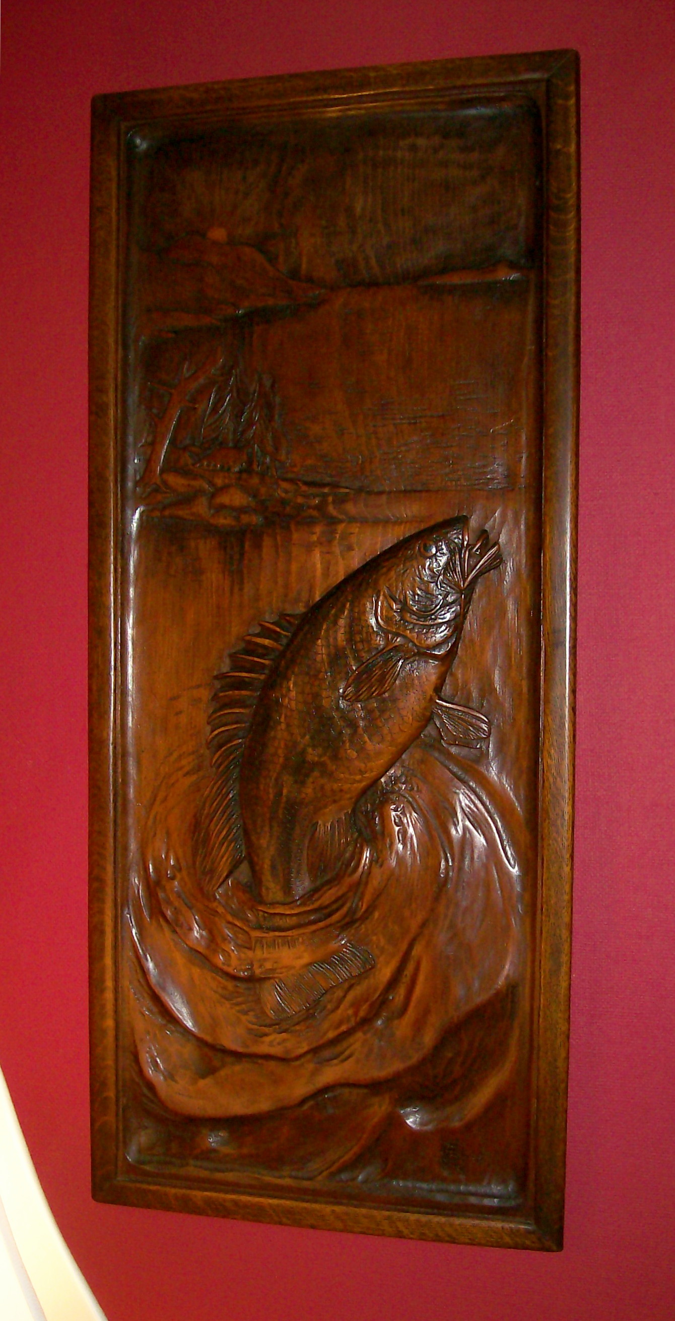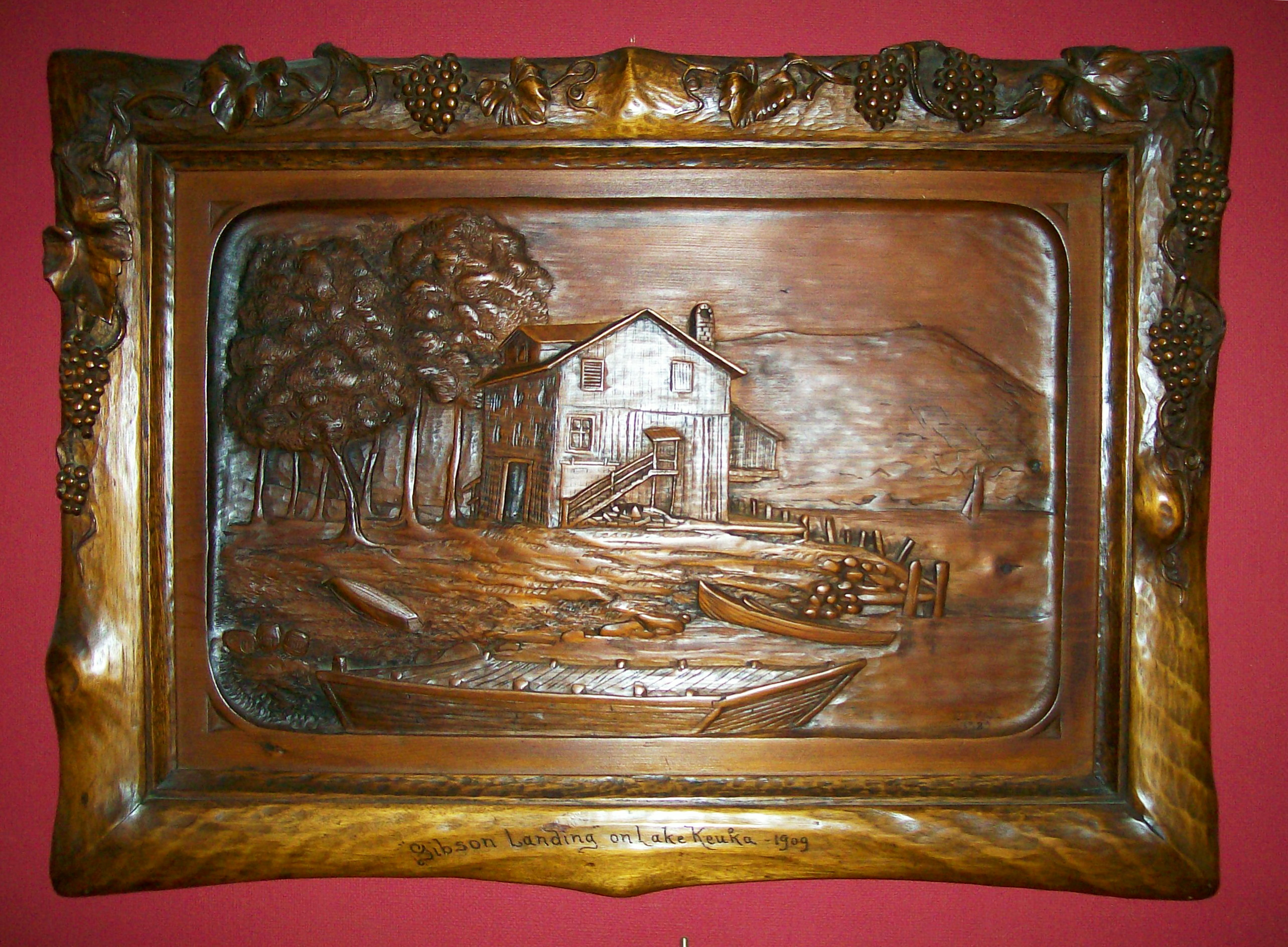 One of the pictorial sculptures, depicts a stream with a hooked fish leaping from the water. This carving has been displayed by the Izaac Walton league throughout the country. Another of his prized reliefs shows the old boat landing as it appeared 20 years ago at Prattsburg - on Keuka Lake. The picture of this carving was provided by Charles' grandson and may be the boat landing referenced in the article. Many of Hall's historical scenes are carved on chests, fireplaces and panels. He has been offered fabulous prices for several of his reliefs, but declines to part with them.