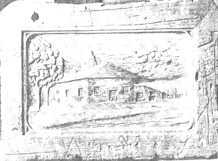 Hall, in 1909, visited the old school building, 1½ miles north of Prattsburg, where he attended school before he was stolen from his home. He discovered the old building partially in ruins. A sketch was made of the old place. A neighboring school trustee gave Hall permission to remove the desk top that he used while in the school. This top he has used as a frame for the carving of the old building. Crudely engraved on the desk top are many initials. Hall discovered the initials "L. T. C." on it. "Those initials were carved by Lyman T. Chappell," said Hall. "He and I sat at the double desk. I learned recently that Chappell became a prominent lawyer in New York. I understand he is now dead.