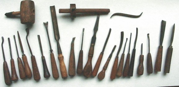 Upon a recent visit to the Elbert Hubbard Museum, located in a Roycroft-built Arts and Crafts bungalow located at 363 Oakwood Ave., East Aurora, NY, I had the opportunity to view and photograph the tools that belonged to Charles Hall. These had been donated to the museum by a gentleman from Rochester, NY. These carving tools, of which there were chisels, gouges, small scorps, rifflers and a mallet, certainly gave me the impression that Charles Hall had used more than a penknife.