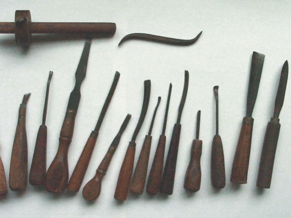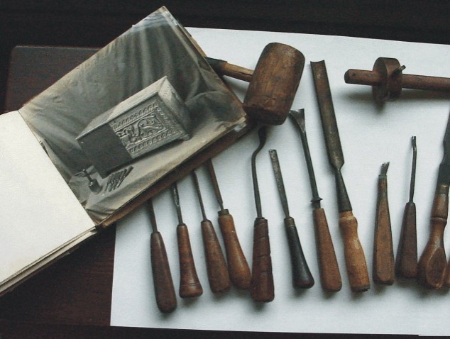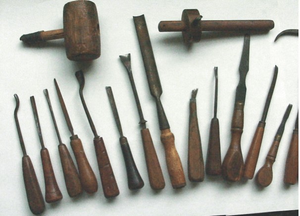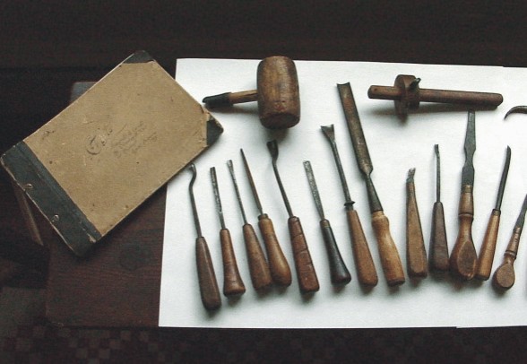 Charles S. Hall's tools with the album page that shows the half-carved chest